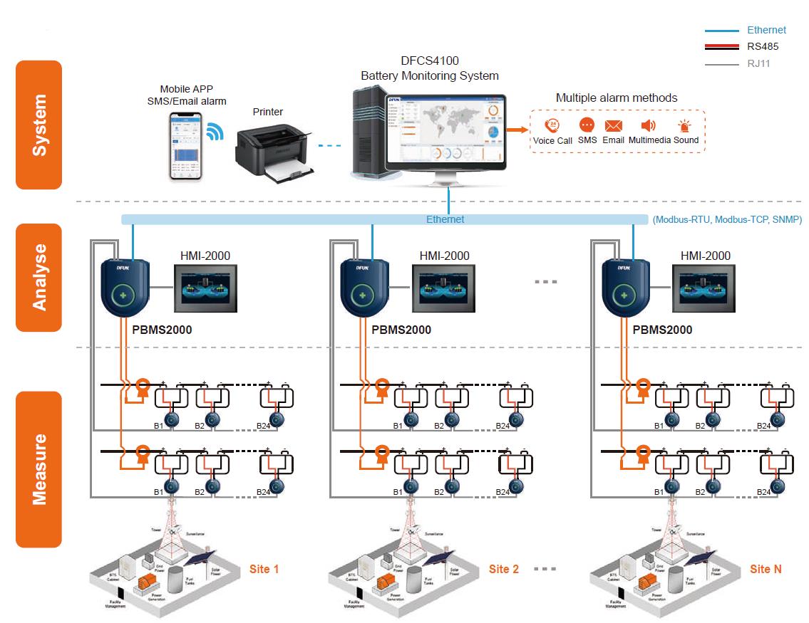 Pour la solution de surveillance des batteries de télécommunications, DFUN fournit PBM2000 et PBAT-Gate pour chaque station BTS et fournit DFCS4100 comme système de surveillance centralisé pour plusieurs stations séparées.