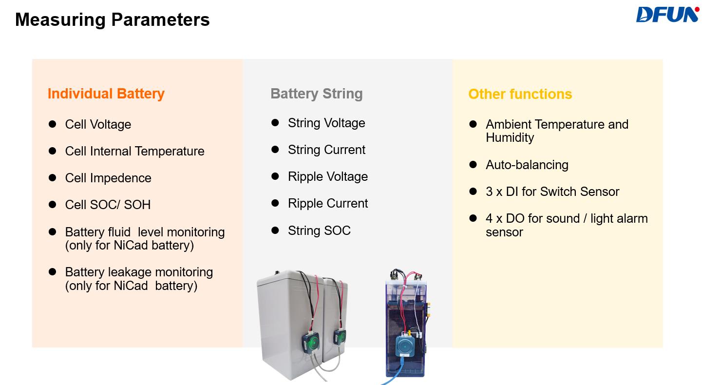 Sauf que, DFUN peut personnaliser des solutions avec une conception unique en fonction des besoins de l'industrie. Par exemple, certaines solutions avec serveur Web intégré pour les petites salles UPS, ce qui permet aux petites salles de centres de données de réduire les coûts ; certaines solutions sont étanches IP65 pour l'industrie chimique qui a un environnement d'application spécial ; et certaines solutions peuvent être apportées sans avoir besoin de tirer de l'énergie des piles. Dans l’ensemble, vous pouvez trouver votre solution personnalisée de surveillance de batterie avec DFUN.