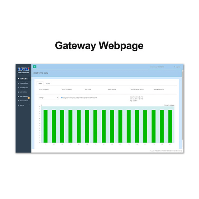 - Alarme de point de consigne pour la tension de cellule, la température interne, l'impédance, SOC, SOH (limite supérieure/limite inférieure) et la tension de chaîne, le courant, SOC (limite supérieure/limite inférieure)